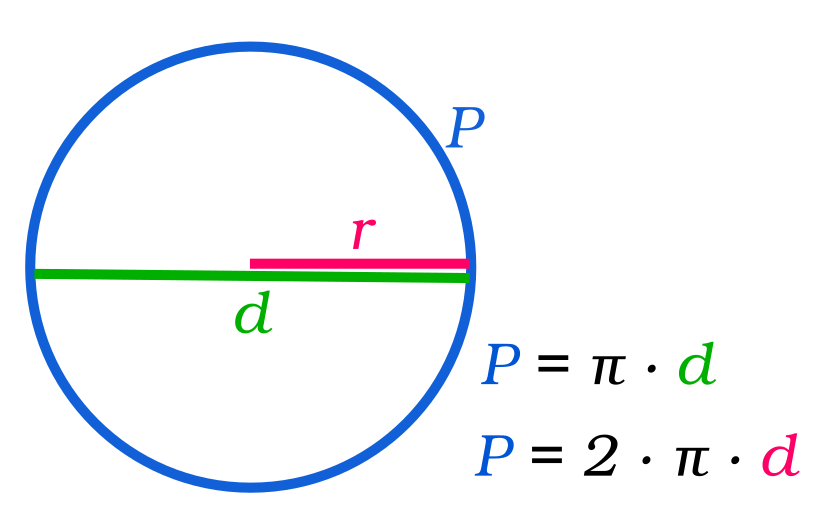 Како што видовме, 𝜋 служи за да се пресметува периметарот на круг. Периметарот на еден круг е точно долг колку 𝜋 дијаметри, или два 𝜋 радиуси. Радиус е права линија која го поврзува центарот на кругот со работ - тој е долг колку половина дијаметар.