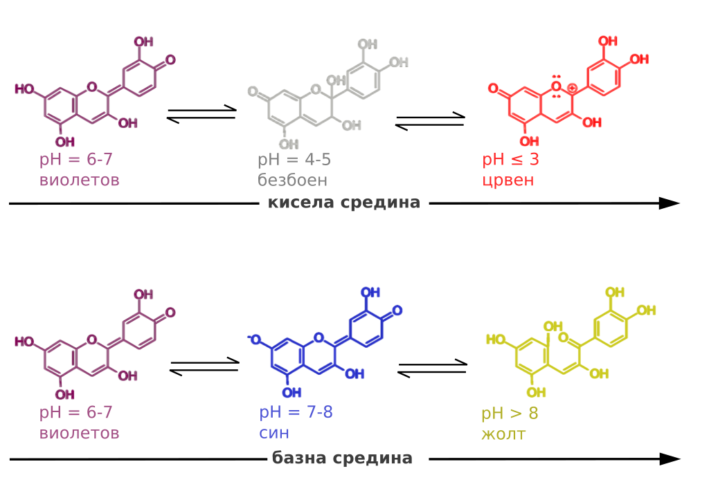 рН во зелката е околу 6,6 и затоа цијанидинот во зелката е виолетов. Молекулата на цијанидин има три активни центри кои можат да реагираат со киселини или со бази. Активни центри се делови од молекулата кои лесно реагираат со други супстанци. Во овој случај тоа се делови во кои има нерамно распределен полнеж, што ќе ги привлече јоните од киселини или бази. Благодарение на повеќето активни центри, цијанидинот може да се трансформира во повеќе различни молекули во зависност од pH вредноста на средината во која се наоѓа, а тие различни молекули имаат различни бои.