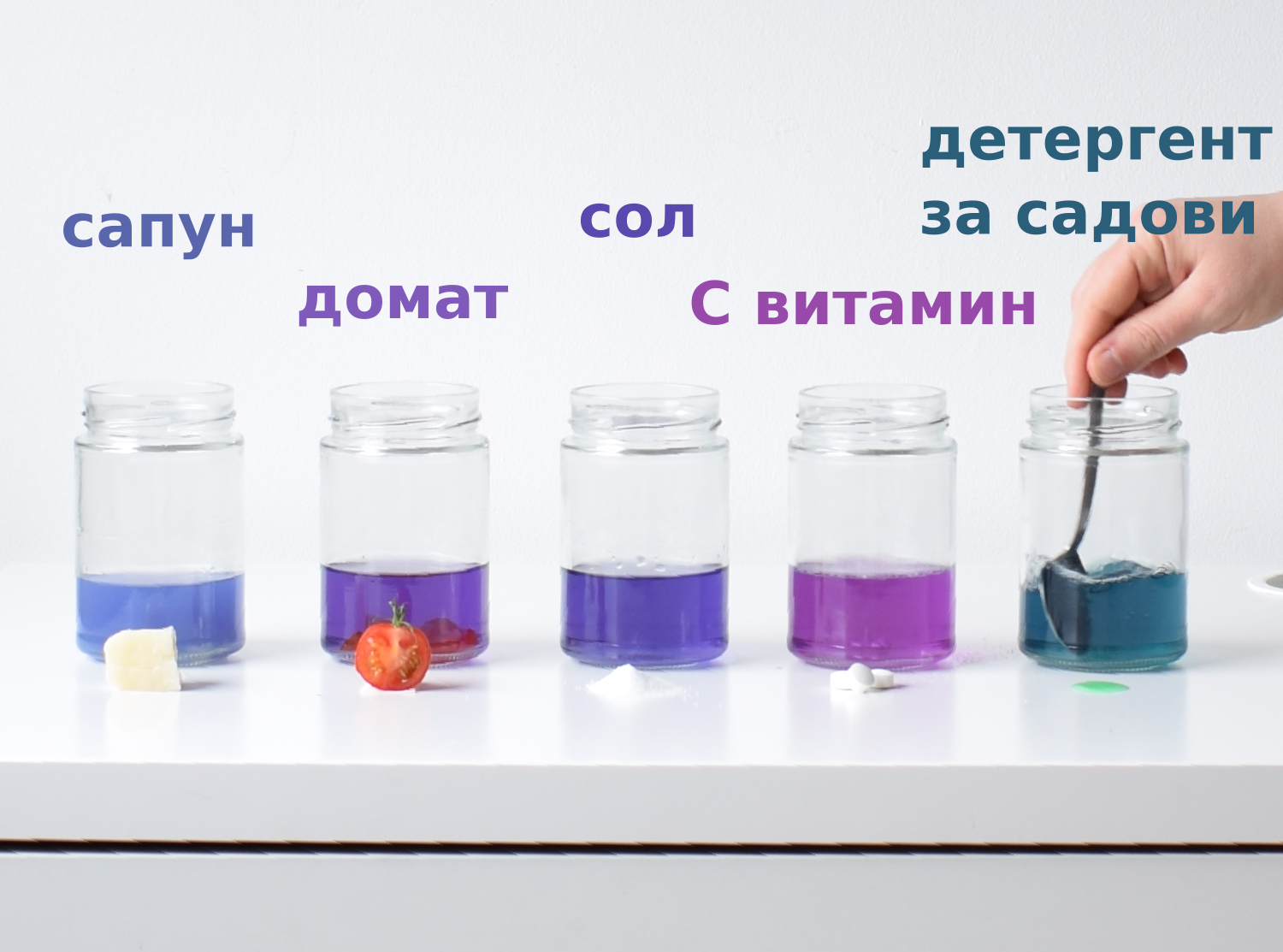 Експериментирај со менување на киселоста на растворот. Почни со раствор од сок од зелка и најбазната супстанца која ја имаш, онаа која го прави сокот син или зелен. Додај ја најкиселата супстанца која ја имаш, и види како се менува бојата на растворот. Ние експериментиравме со детергент за садови како база, и лимонтус како киселина. Сликај или сними го твојот експеримент, и сподели го со твоите заклучоци со таг #НаукаЗаДеца!